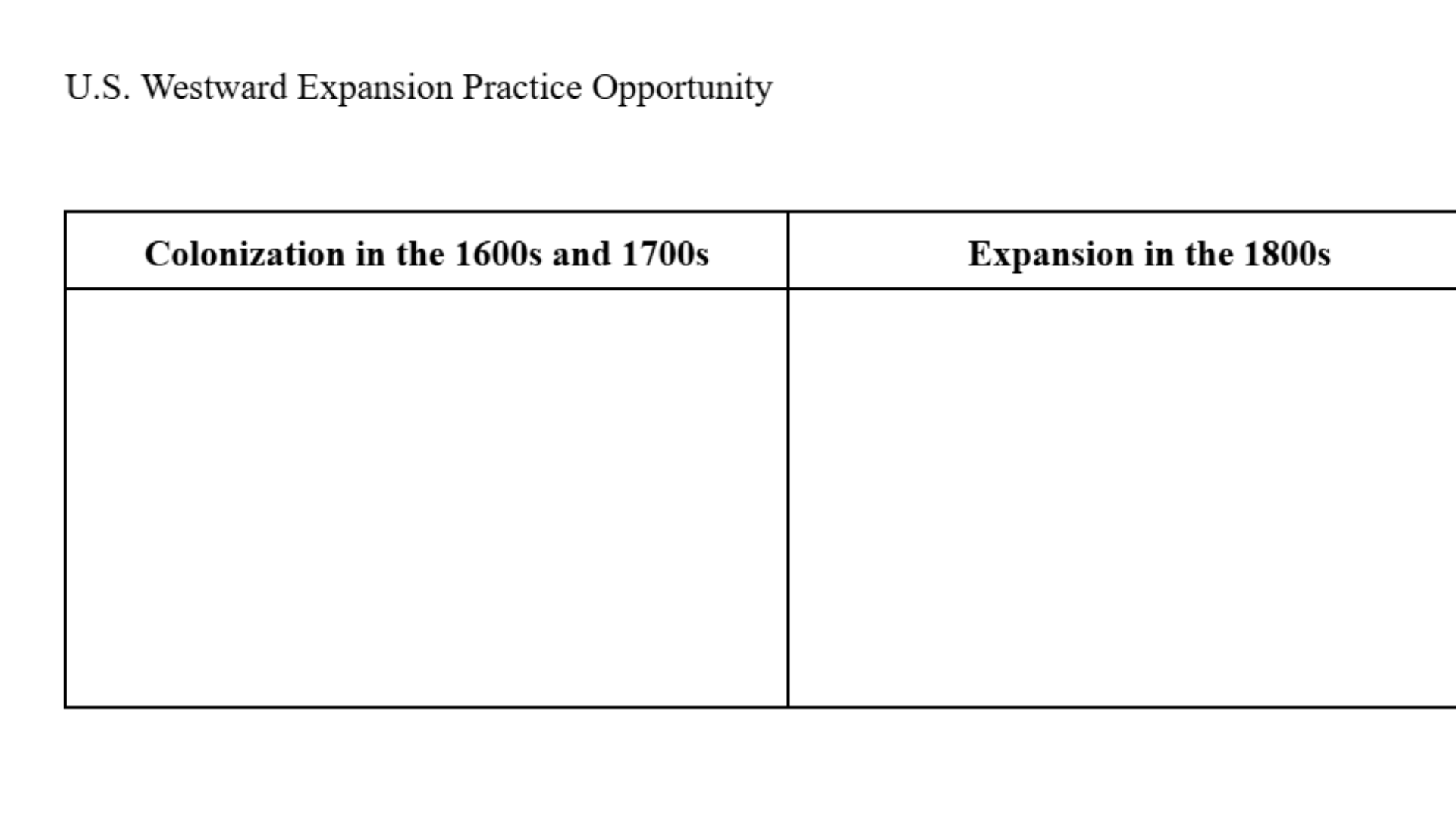 For this activity, students learned about expansion in the early 1800s, and as they learned, they compared how that went with the colonization of the 17th and 18th centuries.